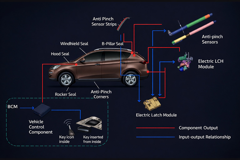 JLT’s anti-pinch systems combine sensor-embedded sealing strips, control modules, and actuators to detect obstacles and prevent entrapment during automatic closing.